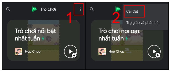 + Bước 1: Bạn nhấn mở ứng dụng Play Games. Rồi hãy chọn biểu tượng ba chấm dọc. Bấm chọn Cài đặt nhé.