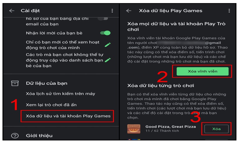 + Bước 2: Bạn bấm chọn Xóa dữ liệu và tài khoản Play Games. Bấm chọn tiếp Xóa vĩnh viễn (2) để xóa mọi dữ liệu và tài khoản tại Play Game hoặc là chọn tiếp Xóa (3) tại trò chơi mà bạn muốn xóa dữ liệu game.
