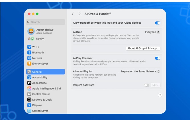 Bạn mở System Settings. Chọn General. Chọn AirDrop & Handoff và thực hiện kích hoạt tùy chọn AirPlay Receiver.