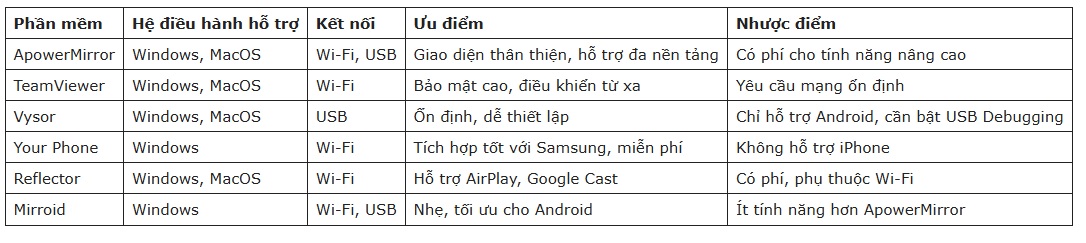 Nhiều phần mềm hỗ trợ cho bạn chiếu màn hình điện thoại lên máy tính với tính năng đa dạng. Dưới đây là bảng phần mềm được chúng tôi tổng hợp: