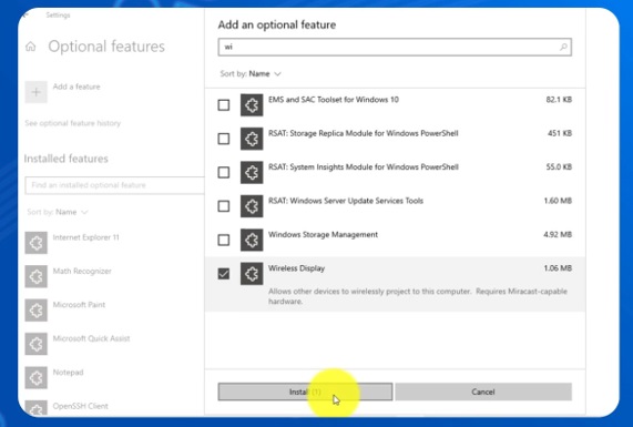 Bạn chọn Add a feature. Bạn tìm Wireless Display. Sau đó bạn nhấn vào chọn Install để cài đặt.
