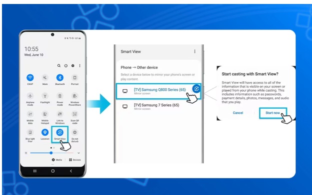 Ở trên điện thoại, bạn vào Cài đặt hiển thị (Display Settings) hoặc là Công cụ nhanh (Quick Settings). Bạn chọn Screen Mirroring, Smart View, hoặc là Cast (tùy theo hãng máy).