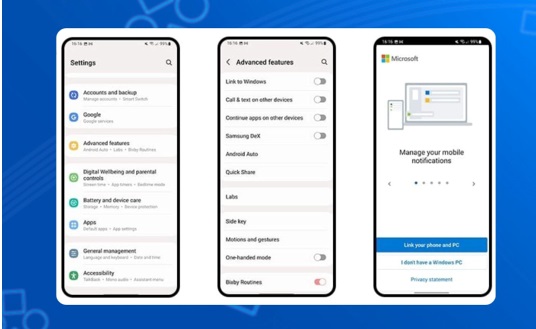 Bạn mở Cài đặt. Chọn Tính năng nâng cao (Advanced Features). Chọn Link your phone and PC.