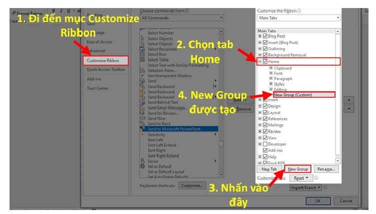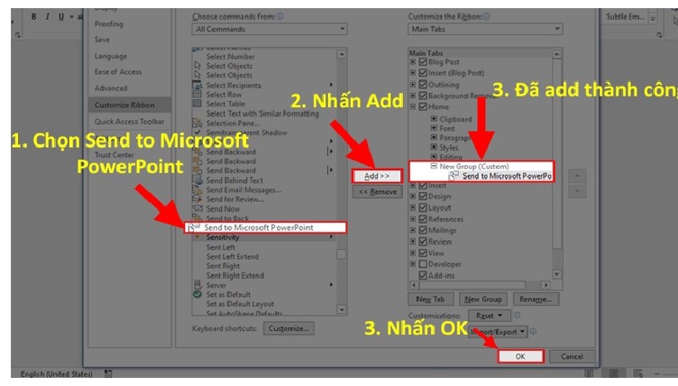 Bước 5: Bạn nhấn chọn lệnh Send to Microsoft PowerPoint ở danh sách bên dưới. Bạn nhấn vào Add để thêm vào New Group ở trên tab Home. Bạn nhấn OK.