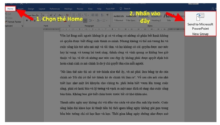 Bước 6: Bạn quay lại giao diện Word. Khi đến Thẻ Home. Hãy nhấn vào Send to Microsoft PowerPoint để có thể chuyển toàn bộ dữ liệu từ file Word sang PowerPoint.