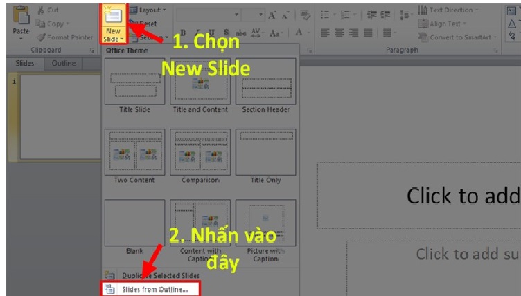 Bước 2: Bạn nhấp và chọn vào New Slide. Bạn nhấn chọn Slide from Outline.