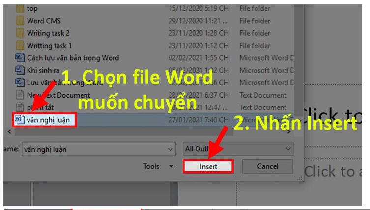 Bước 3: Ở hộp thoại Insert Outline thì bạn bấm chọn file Word muốn chuyển sang PowerPoint. Bạn nhấn Insert để chuyển file Word sang được PowerPoint.