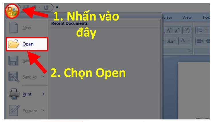 Bước 1: Bạn thực hiện mở file PowerPoint. Bạn nhấp vào nút Microsoft Office (đối với trình duyệt Word 2007) hoặc là Thẻ File (Word 2010). Rồi bạn chọn Open.