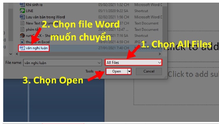 Bước 2: Bạn nhấn vào chọn All Files. Rồi sau đó tìm file Word muốn chuyển đổi. Bạn nhấn vào Open để chuyển file Word sang file PowerPoint.