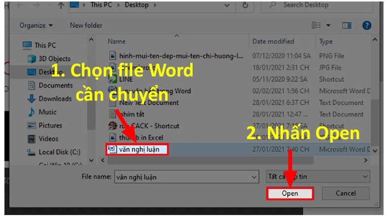Bước 3: Bạn chọn file Word cần chuyển đổi. Bạn nhấn chọn Open.