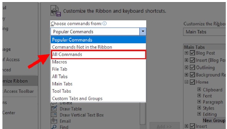 Bước 4: Bạn đi đến phần Choose Commands from. Bạn chọn mục All Commands.