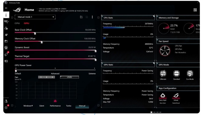 Bước 3: Bạn mở phần mềm Armoury Crate. Rồi chọn Manual Mode. Để điều chỉnh thanh trượt tốc độ quạt.