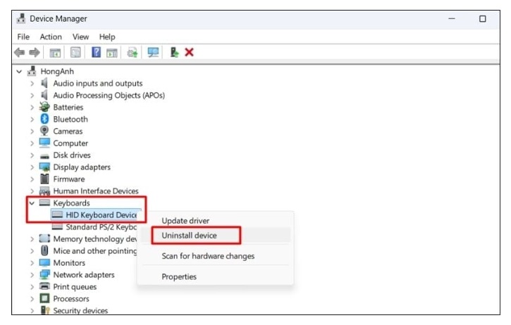 - Bước 3: Bạn nhấn chuột phải vào tên bàn phím (thông thường là HID Keyboard Device) và bạn chọn Uninstall device.