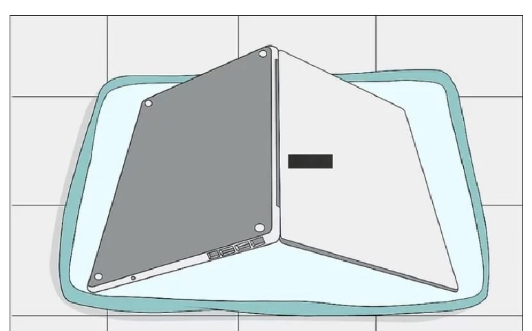 - Bước 2: Hãy lật ngược máy hình chữ V. Rồi bạn hướng bàn phím xuống dưới để cho nước thoát ra ngoài và tránh thấm vào mainboard.