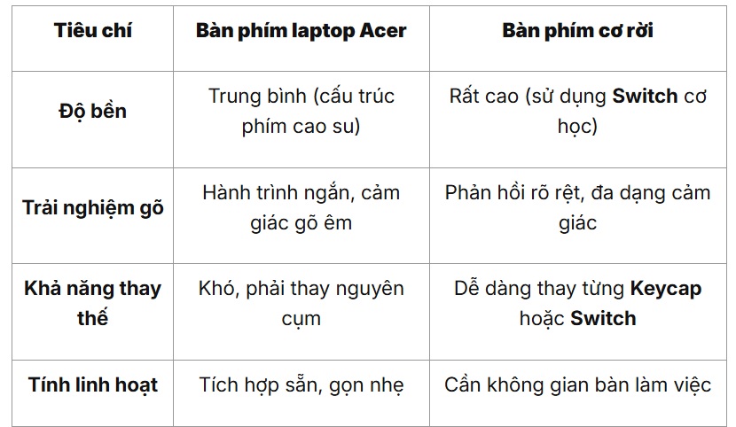 5. Bảng so sánh các đặc điểm của bàn phím laptop Acer và bàn phím rời