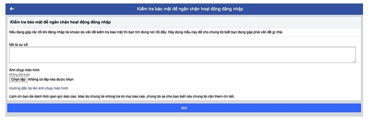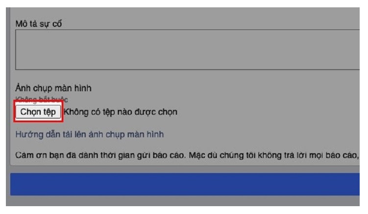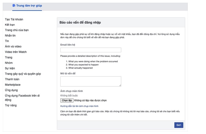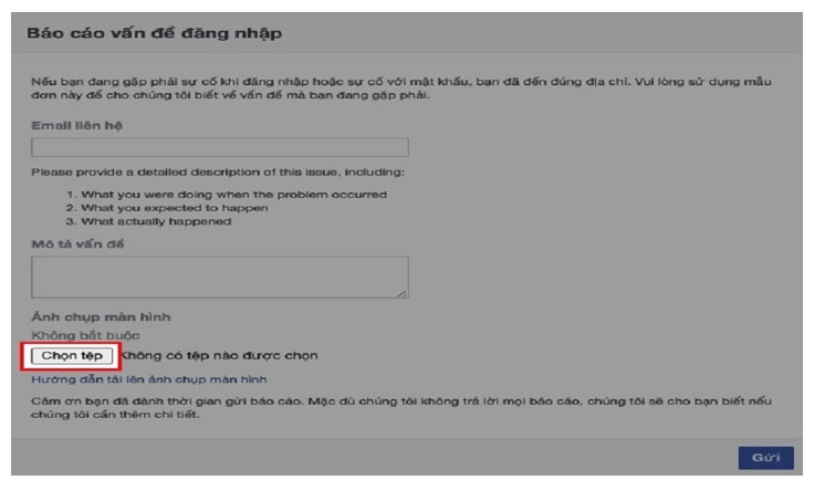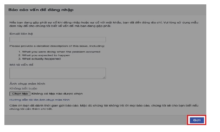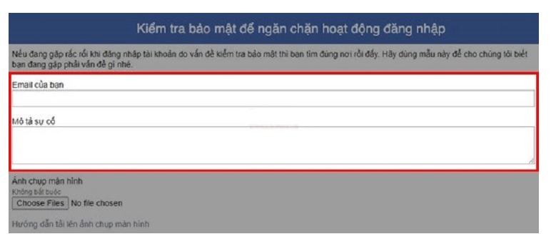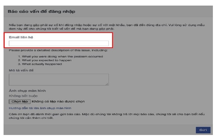 Bước 2: Đối với trường hợp mà tài khoản Facebook của bạn được đăng nhập bởi địa chỉ email. Bạn hãy mô tả rõ về vấn đề mà tài khoản của bạn đang gặp phải vào ở phần khung bên dưới mục Mô tả sự cố.