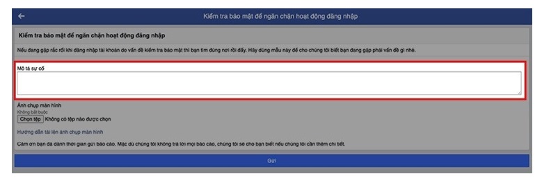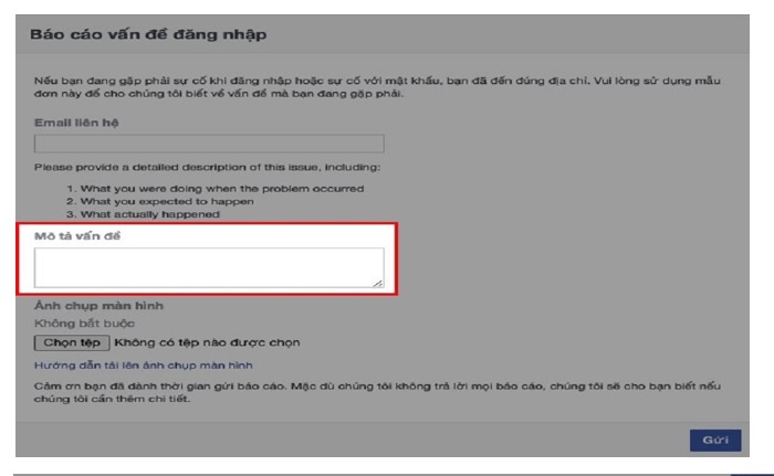 Bước 3: Sau đó, bạn hãy di chuyển xuống phần khung Mô tả vấn đề để bắt đầu việc nhập về nội dung có liên quan đến vấn đề mà tài khoản Facebook của bạn đang bị gặp phải như thế nào.