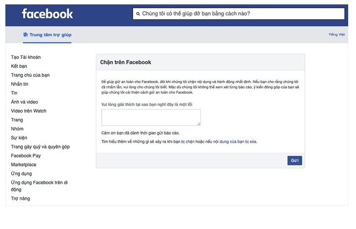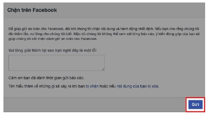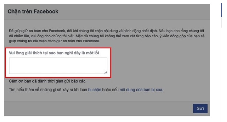 Bước 2: Ở tại ô Vui lòng giải thích tại sao bạn nghĩ đây là một lỗi thì bạn hãy nhập nội dung bạn cần gửi đến ứng dụng Facebook để khiếu nại.