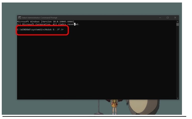 - Bước 3: Ở trong cửa sổ Command Prompt thì bạn nhập lệnh sau. Và hãy nhấn Enter: chkdsk E: /f /r