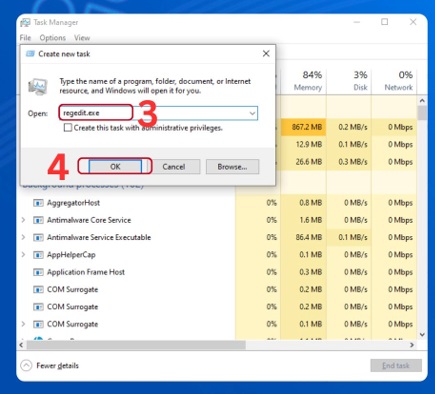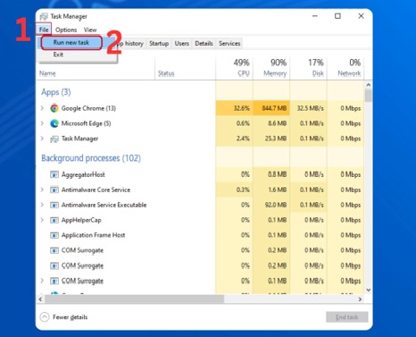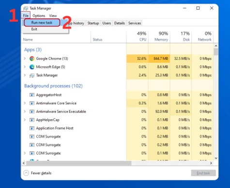 Bước 1: Bạn nhấn tổ hợp phím Ctrl + Shift + Esc hoặc là Ctrl + Alt + Delete để mở Task Manager. Bạn chọn File. Rồi chọn tiếp Run a new task.