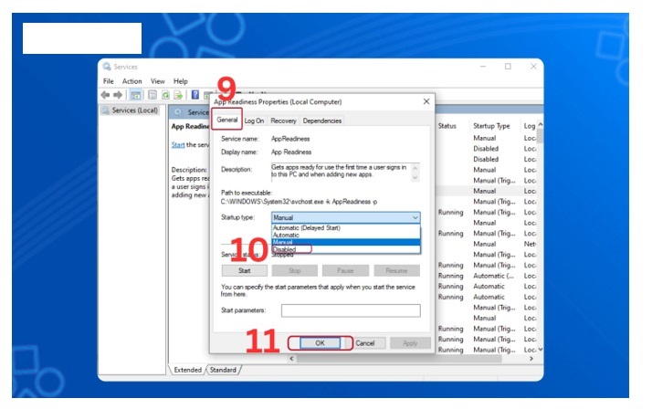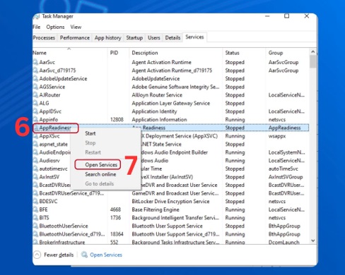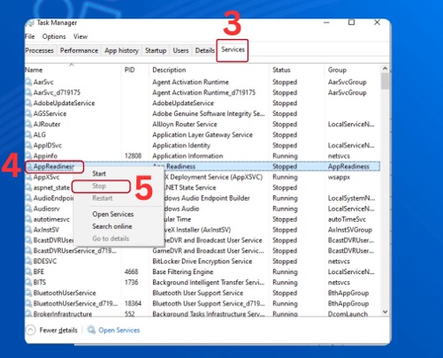 Bước 2: Bạn chọn tab Service. Bạn nhấp chuột phải vào mục App Readiness. Bạn chọn Stop.