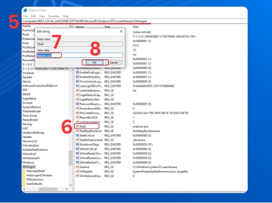 Bước 4: Bạn tìm và chọn mục Shell. Rồi chỉnh sửa Value Data thành “explorer.exe”.