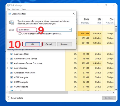 Bước 5: Bạn thực hiện lại các thao tác như bước 1. Sau đó thì nhập lệnh explorer.exe. Và chọn OK.