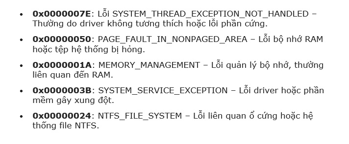 Dưới đây là một số mã gây ra lỗi màn hình xanh phổ biến cùng ý nghĩa và cách xử lý: