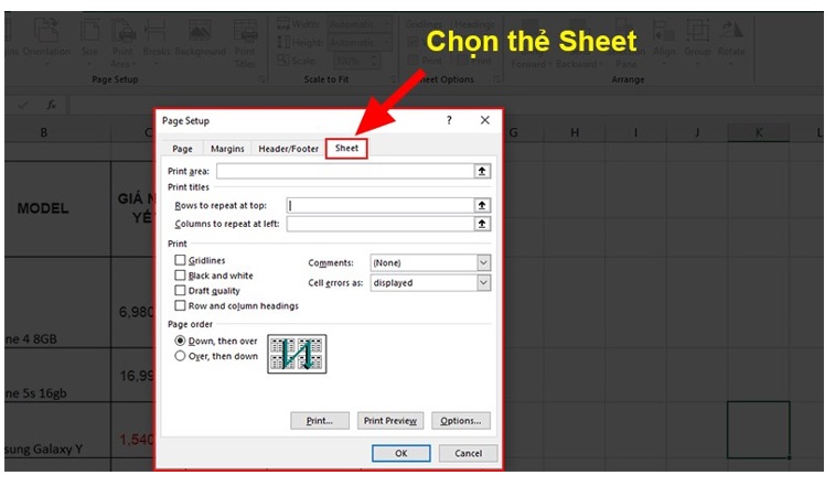 Bước 2: Hộp thoại Page Setup sẽ hiện lên thì bạn hãy đảm bảo rằng mình đang ở thẻ Sheet.