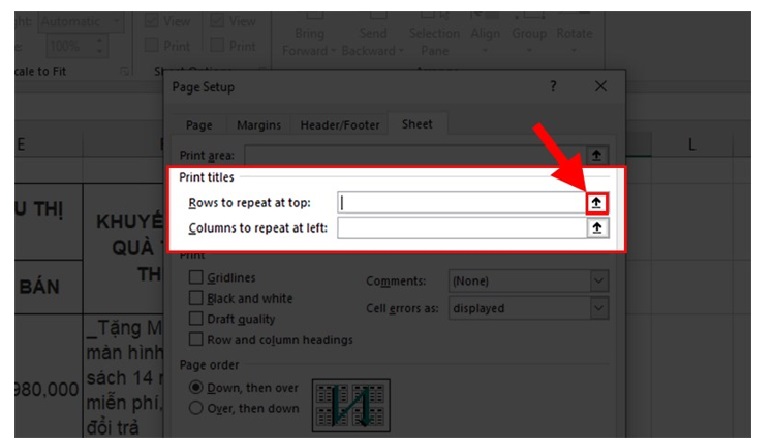 Bước 3: Để thực hiện được cách lặp lại tiêu đề trong Excel theo dòng ngang (dòng 1, 2...) thì tại mục Rows to repeat at top, bạn cần nhấn vào biểu tượng mũi tên hướng lên.