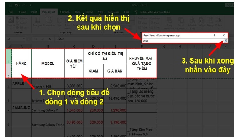 Bước 4: Bạn dùng chuột tích vào chọn vào dòng chứa tiêu đề mà bạn muốn thực hiện lặp lại (Ví dụ bạn click chọn vào số 1 và 2 ở ngoài cùng bên trái). Sau đó bạn nhấn lại mũi tên hướng xuống để có thể quay về hộp thoại.