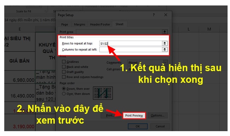 Bước 5: Dòng tiêu đề bạn đã lựa chọn sẽ xuất hiện ở Rows to repeat at top. Bạn hãy nhấn Print Preview để xem trước.
