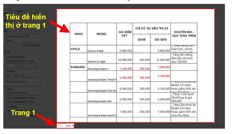 Nếu như bạn muốn in bảng tính trở về trạng thái bình thường (thì chỉ trang 1 có tiêu đề). Bạn hãy làm như sau:
