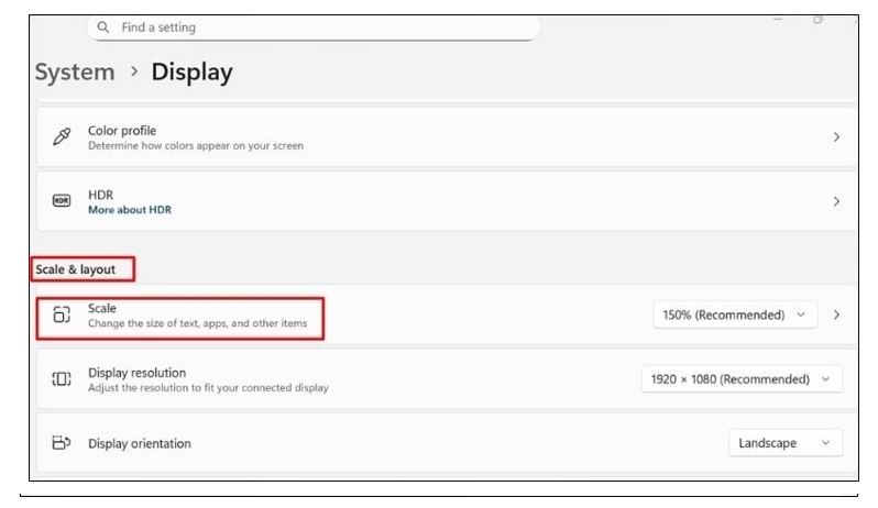 · Bước 3: Tiếp theo thì bạn kiểm tra mục Scale and layout. Bạn hãy điều chỉnh về mức 100% hoặc 125% tùy theo kích thước của màn hình để các biểu tượng không bị quá to hoặc là quá nhỏ.