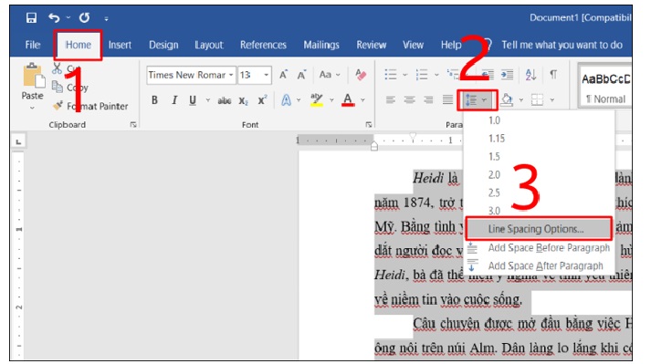 Bước 1: Bạn bấm vào Home. Rồi bạn nhấn chọn biểu tượng giãn dòng ở trong mục Paragraph. Bạn bấm chọn Line Spacing Options.