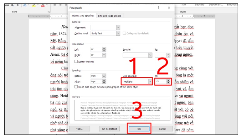 Bước 2: Ở tại phần Line Spacing, bạn hãy chọn Multiple. Hãy thực hiện nhập thông số giãn dòng tại mục At. Rồi bạn nhấn OK để hoàn thành.