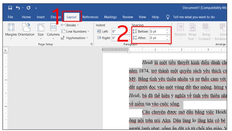 Để thực hiện việc giãn dòng trong Word bằng Spacing thì bạn tiến hành vào mục Layout. Bạn hãy nhấn vào nút mũi tên lên/ xuống hoặc là nhập trực tiếp thông số vào mục Before và mục After để điều chỉnh được khoảng cách trước và sau đoạn văn.