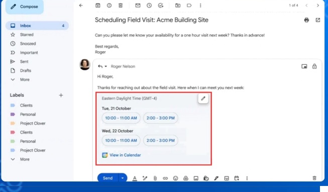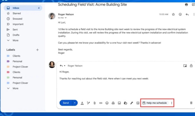 Việc để tìm kiếm một khung thời gian phù hợp để họp với đồng nghiệp hoặc là khách hàng giờ đây đã trở nên được đơn giản hơn rất nhiều. Nhờ vào sự trợ giúp của AI Gemini trong Google Workspace. Tính năng mới có tên “Help me schedule” (Giúp tôi sắp xếp). Nó được tích hợp ngay ở trong Gmail và Google Calendar. Và cho phép người dùng tạo được lịch họp tự động một cách nhanh chóng và chính xác. Có thể loại bỏ những chuỗi email thương lượng tốn thời gian.