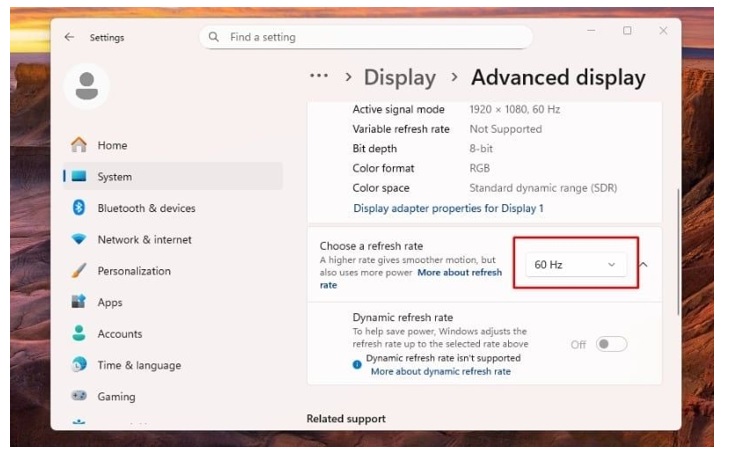 Việc cài đặt tần số quét quá cao so với khả năng chịu đựng của tấm nền thì lỗi có thể gây ra sọc. Bạn hãy vào mục Display Settings. Bạn thực hiện chọn Advanced Display và thử hạ tần số quét từ 144Hz hoặc là 165Hz xuống mức 60Hz. Nếu như sọc biến mất thì tấm nền màn hình của bạn là đang có dấu hiệu suy giảm tuổi thọ.