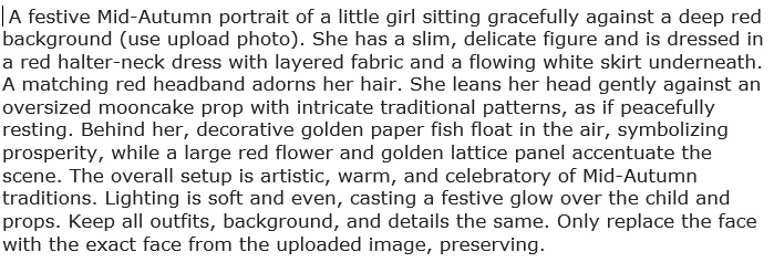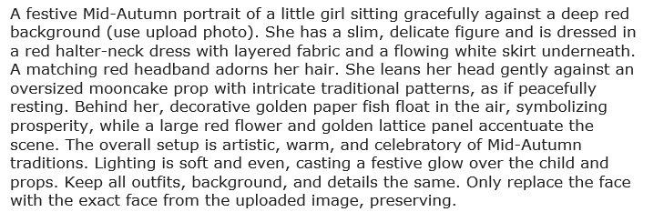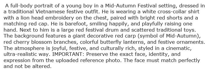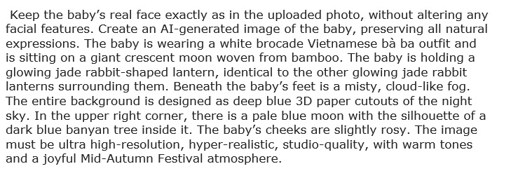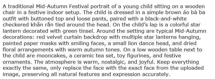 Để tạo được ảnh trung thu cho bé bằng AI hiệu quả thì việc sử dụng đúng câu lệnh (prompt) là vô cùng quan trọng. Dưới đây là tổng hợp những câu lệnh được tối ưu hóa giúp cho bạn tạo ra những bức ảnh trung thu thật lung linh, đáng yêu cho bé yêu của mình: