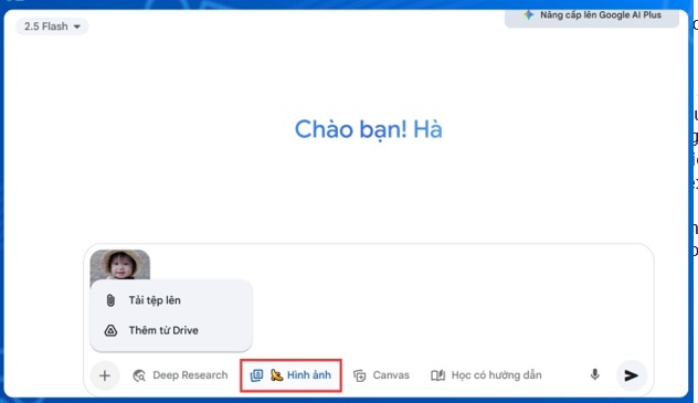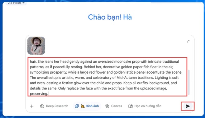 Đây được xem như là bước quan trọng nhất. Bạn hãy thực hiện dán (Paste) một trong những câu lệnh tạo ảnh trung thu cho bé bằng AI đã tổng hợp ở phần I vào ô chat của Gemini nhé.