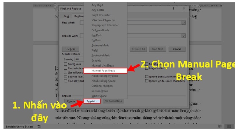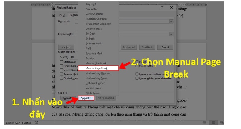 Bước 5: Bạn hãy nhấn vào Special. Rồi bạn chọn mục Manuel Page Breaks.
