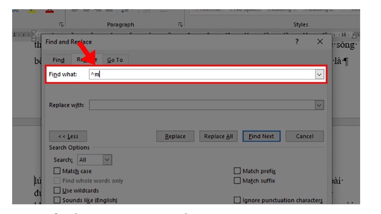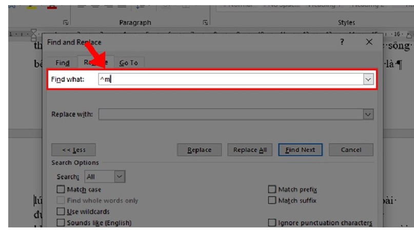 Bước 6: Sau khi bạn chọn xong ở phần Find what sẽ hiển thị ra ký hiệu "^m".