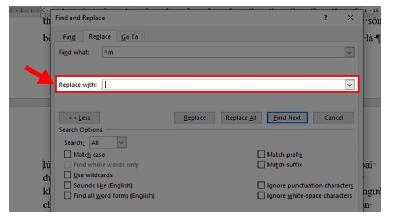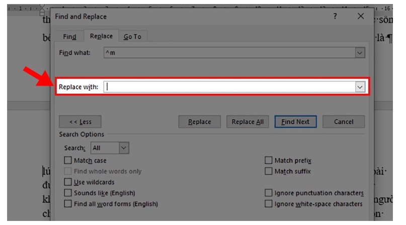 Bước 7: Ở phần Replace with thì bỏ trống.