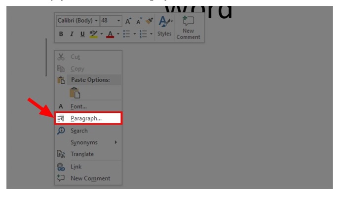 Bước 1: Bạn đưa con trỏ chuột đến vị trí muốn ngắt trang. Bạn nhấn chuột phải. Rồi chọn Paragraph.