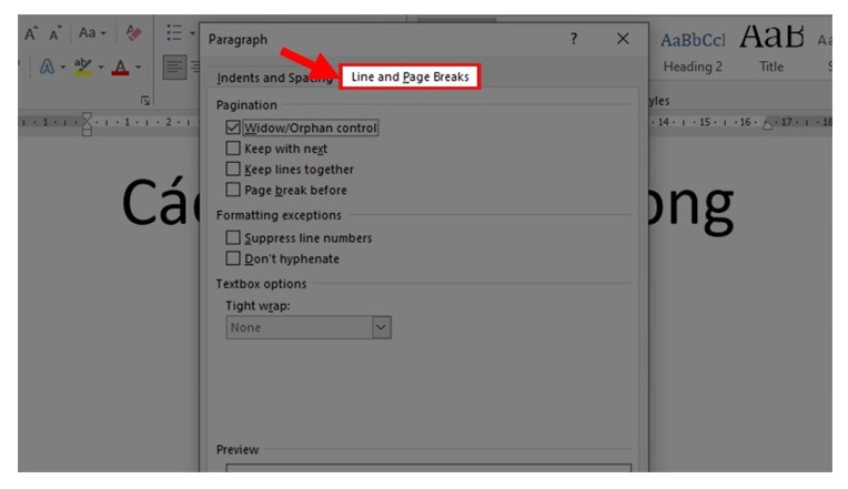 Bước 2: Ở hộp thoại hiện lên thì bạn chọn tab Line and Page Breaks.