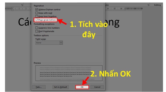 Bước 3: Bạn tích vào ô Page break before. Rồi bạn nhấn OK để ngắt trang trong Word.