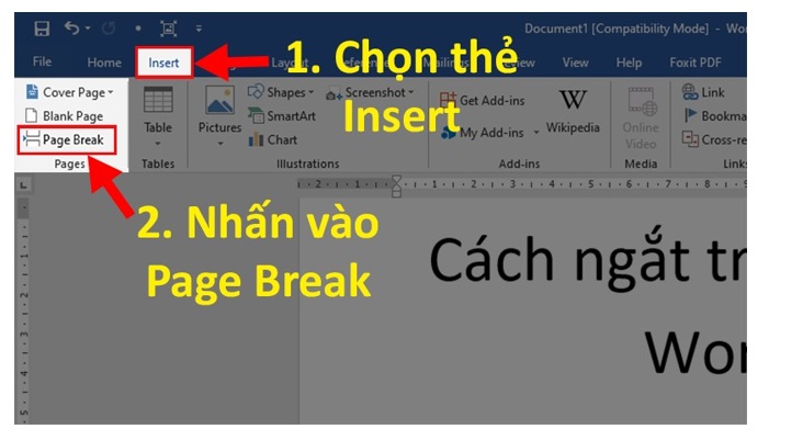 Bước 2: Bạn chọn thẻ Insert. Ở phần tại mục Pages. Bạn nhấn chọn Page Break để ngắt trang trong Word.