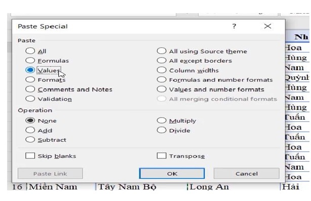 Sau đó các bạn bấm vào chọn Values trong hộp thoại Paste Special: