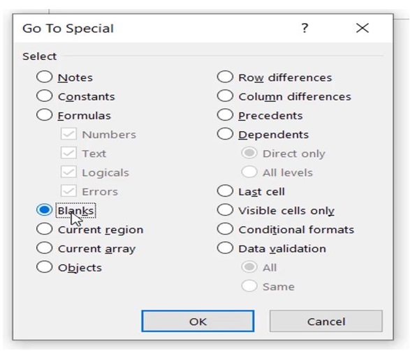 Bước 3: Ở trong hộp thoại Special thì các bạn bấm vào chọn Blanks. Rồi bấm tiếp OK để đi tới các ô trống ở trong vùng dữ liệu.